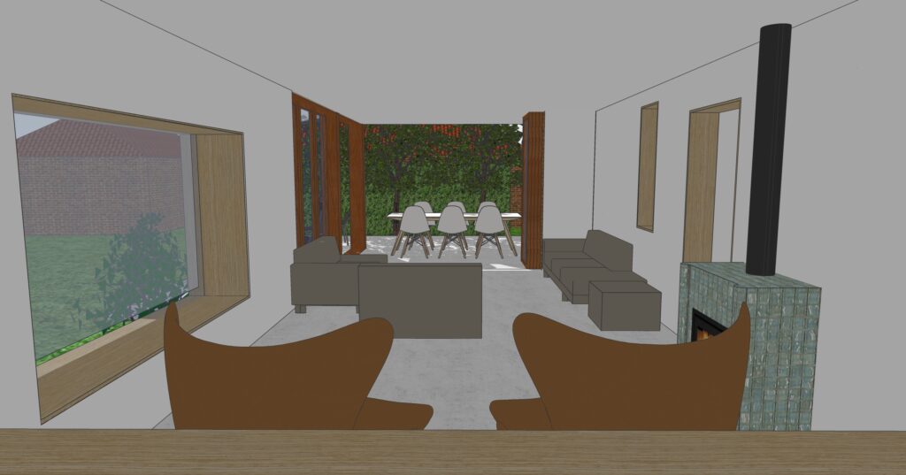 Op het dak van de uitbouw komt een groen dak met een terras voor de slaapkamers op de eerste verdieping.