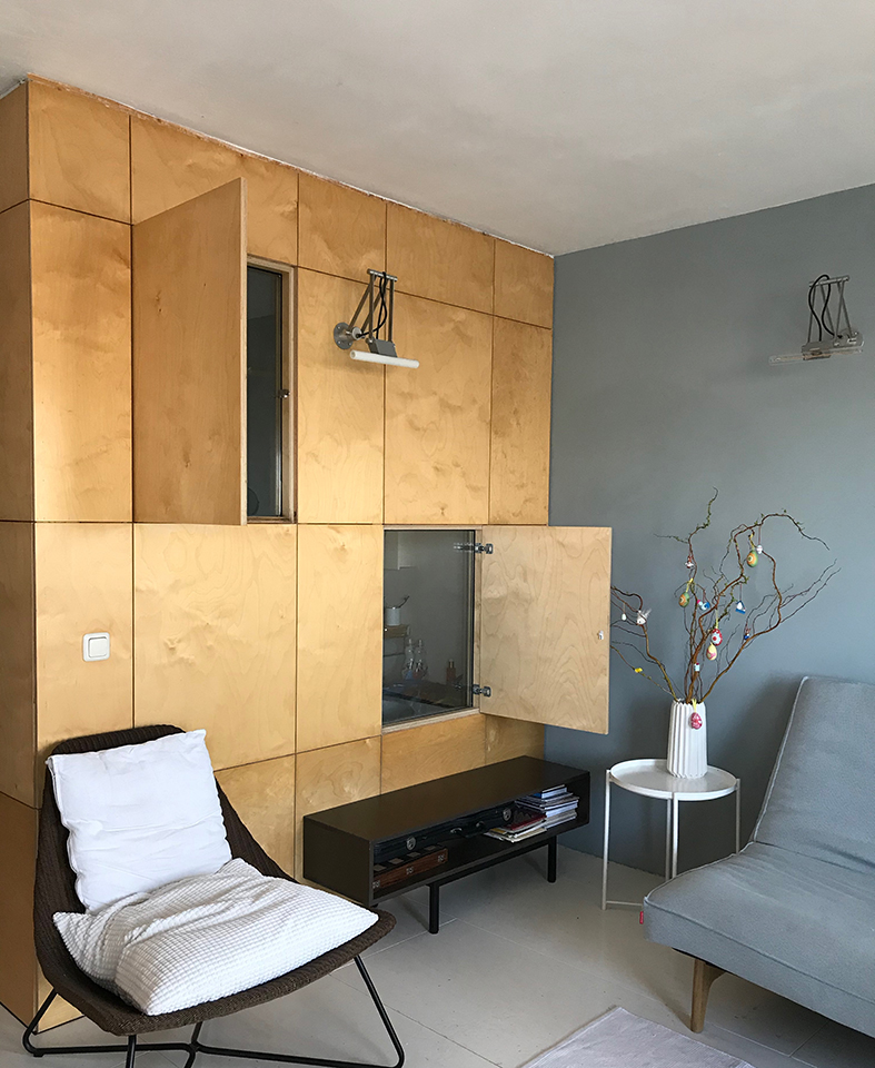 De wand tussen badkamer en woonkamer heeft twee luikjes die open kunnen om naar buiten of de TV te kijken